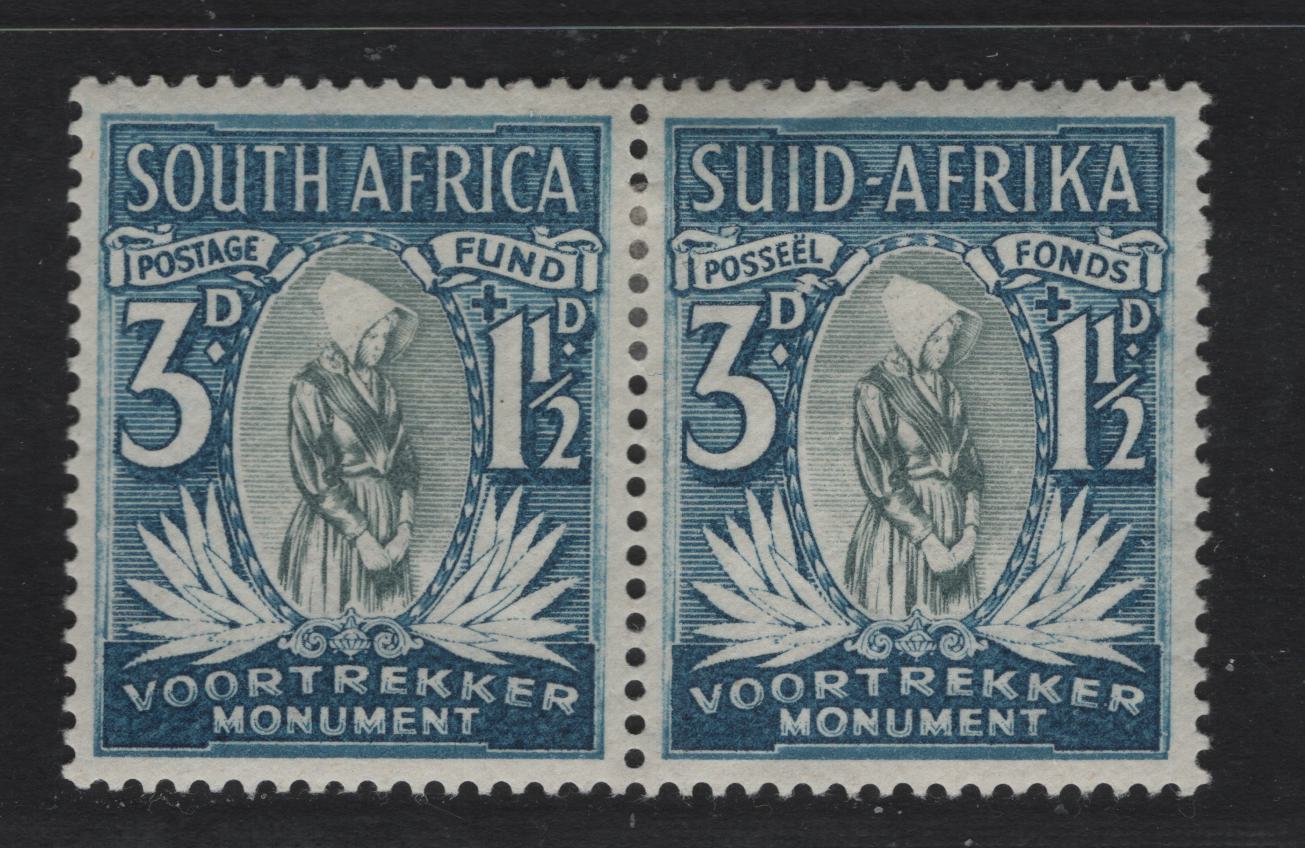 A VFOG se-tenant pair of the 3d + 1.5d deep blue & gray Voortrekker Woman from the 1933-1936 Semi Postal Issue, perf 14, Wmk 201.