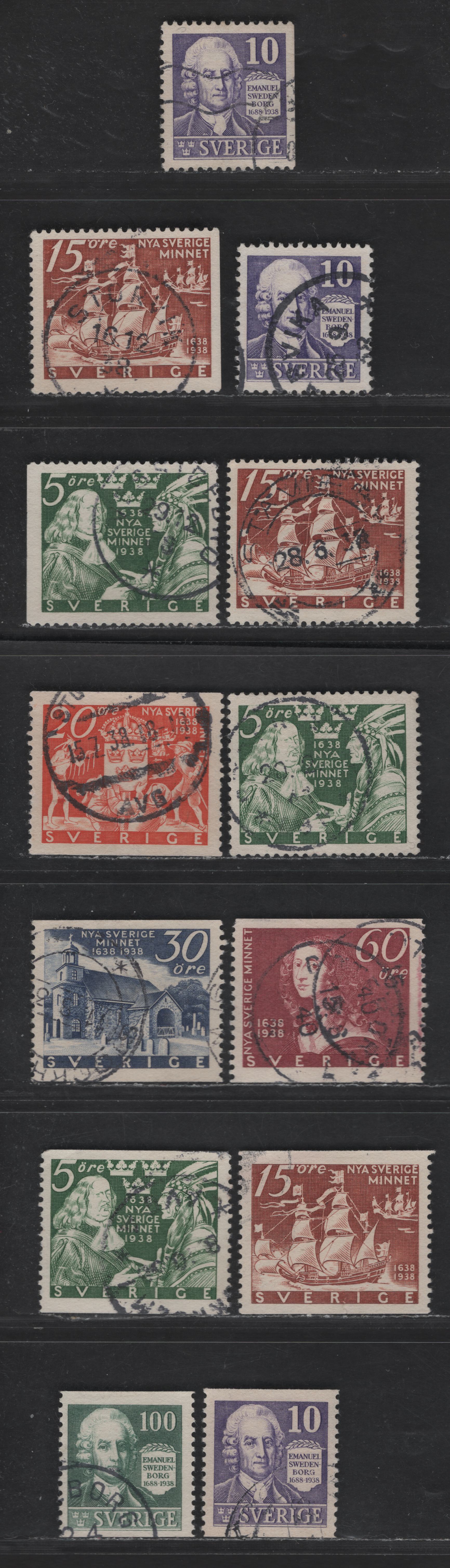 Sweden SC#264-274, 273a, 274a 10o - 15o Violet - Brown Emanuel Swedenborg, 1938 Pictorial Issues, 13 Fine/Very Fine Used Singles, Perf 12.5 & 12.5 Vert