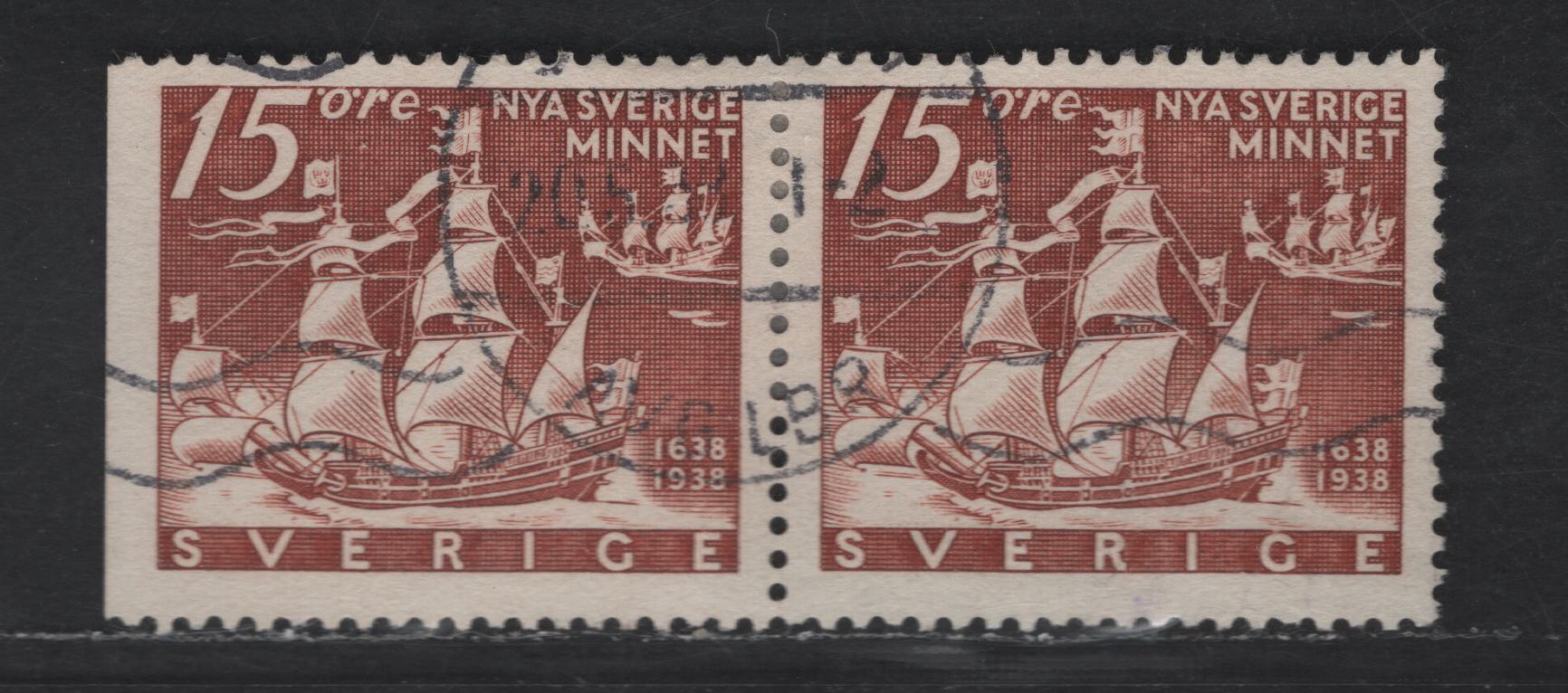 A fine used pair of the 15o brown Kalmar Nyckel Sailing From Gothenburg from the 1938 Pictorial Issue, perf 12.5, sheet & booklet straight edged stamps.
