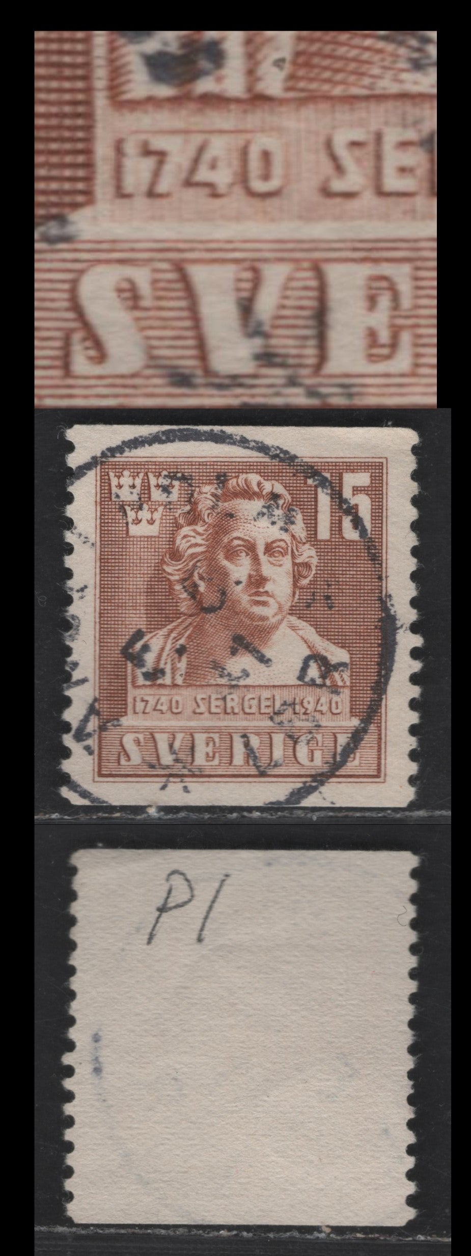 Lot 179 (C) Sweden SC#314var (Facit # 326P2) 15o Light Brown Tobias Sergel, 1940 Pictorial Issue, A Very Fine Used Single, Line Above '1740' Variety
