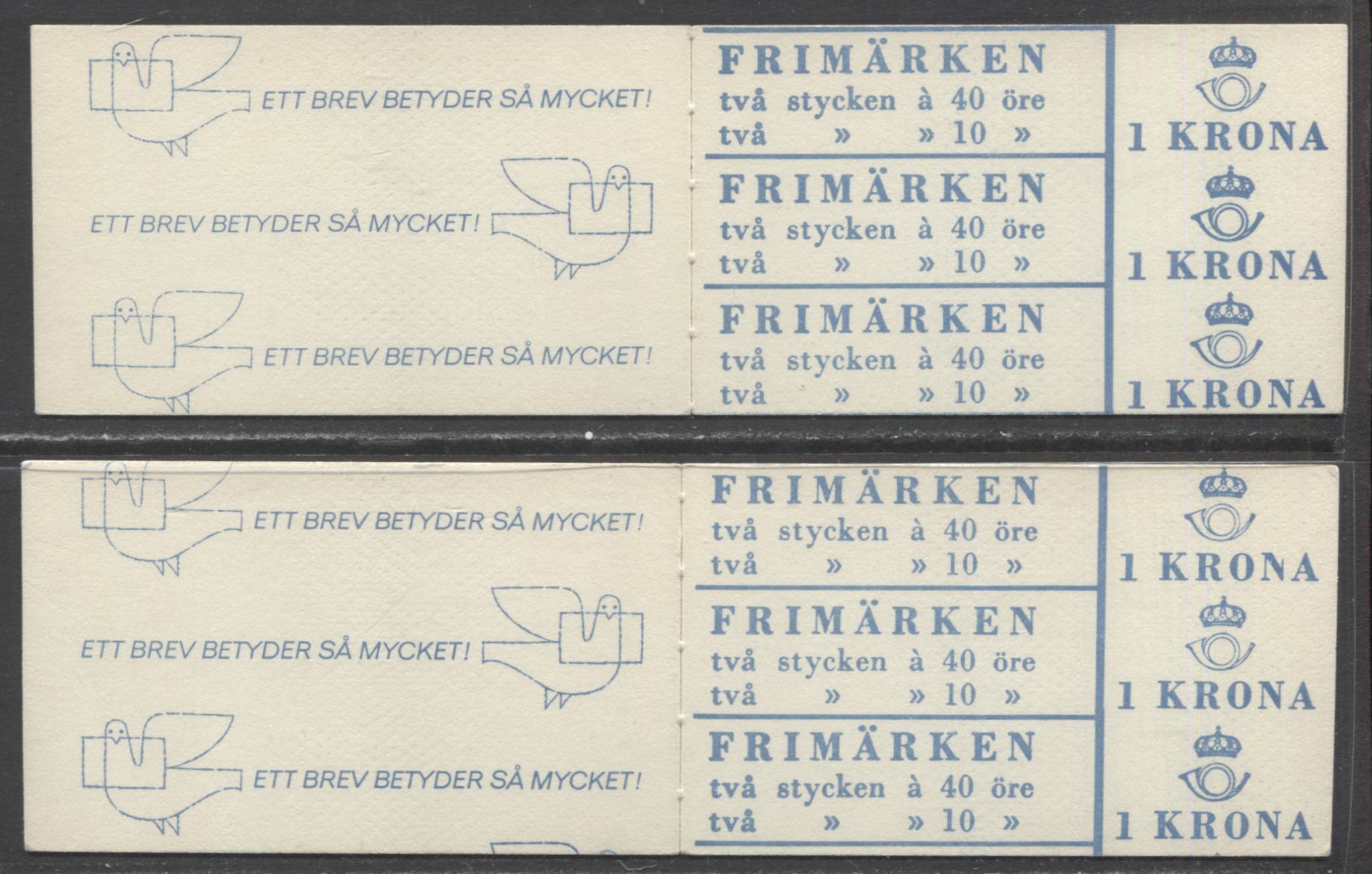 2 VFNH booklets of 4 (2 +2) from the 1964 Re-Engraved King Gustav VI Adolf Definitive Issue. Upright panes, stamps out of vertical alignment, two slightly different shades. The Scott and Facit numbers range from 669b (Facit #HA12ARV) to 669b (Facit #HA12B1RV), and include 669b (Facit #HA12ARV, B1RV). The booklet covers show repeating lines of text on the front, are blank on the back, and show a dot pattern. The dot pattern on the covers are little divots that run the length of the cover. I've seen these exact same divots on examples of the integral Centennial Issue booklets of Canada, most notably BK69, but others as well. The 10 ore stamps are at the left, and the blues are very slightly different shades, which is best seen by comparing the Gustaf VI Adolf stamps. 2014 Facit Cat Kr. 33. Our estimate of the value based on the condition is $5.