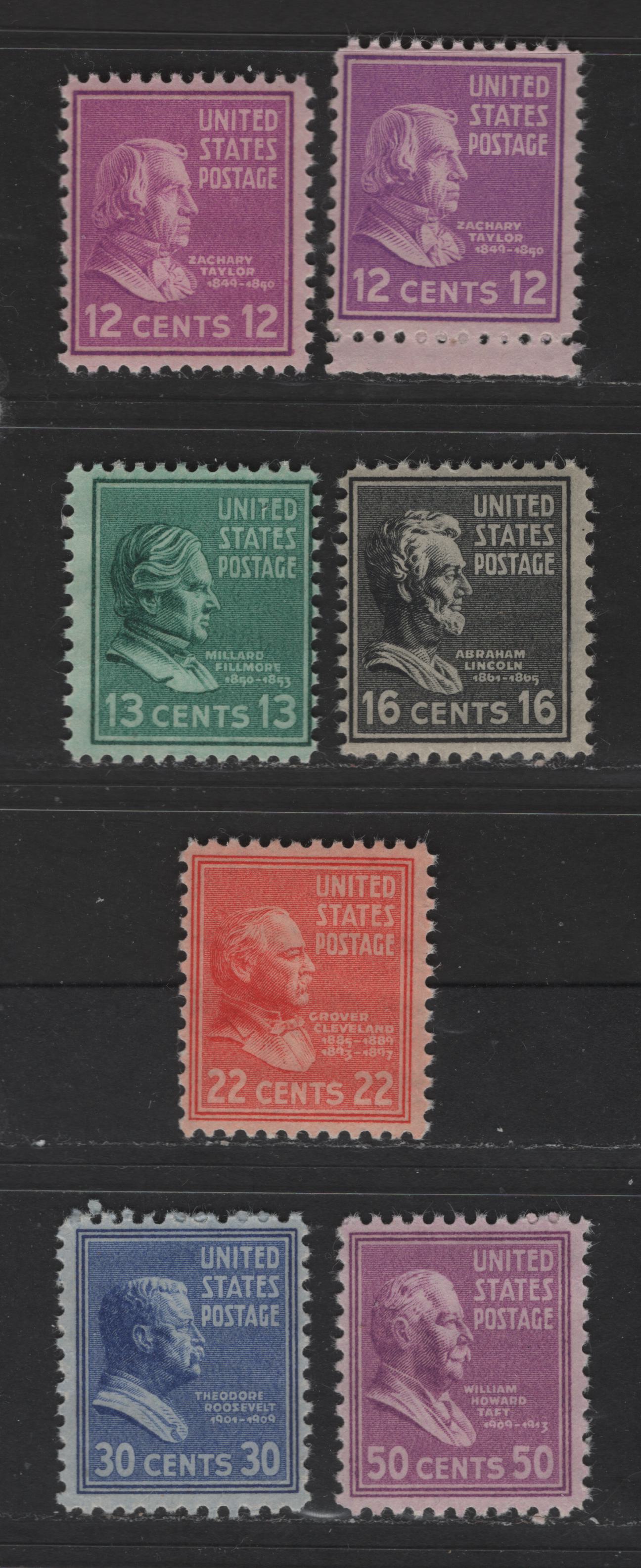 7 fine NH singles of the 12c-50c bright mauve - mauve Zachary Taylor - Willam Howard Taft from the 1938-1954 Presidential Issue different ridge patterns & gum breaker ridges per stamp. Includes the following: 12c, 13c with 14 ridges on the gum and 3 gum breaker ridges; 12c without any ridges or gum breaker ridges; 16c with 14 ridges on gum and 2 gum breaker ridges; 22c with no ridges and 4 gum breaker ridges per stamp; 30c and 50c with 14 ridges and 4 gum breaker ridges per stamp.